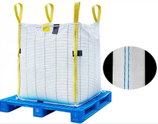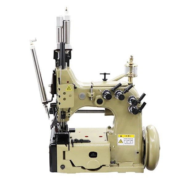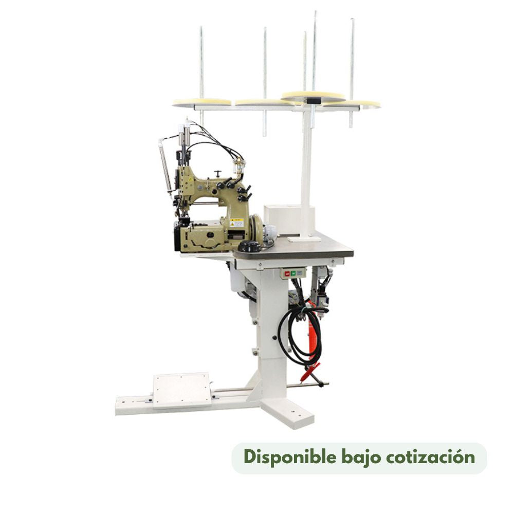 Máquina overlock de costura en cadeneta de 2 agujas y 4 hilos especial para coser sacos “big bag” (jumbo) con elevador de prensatelas neumático y cortador de cadeneta (en caliente) completa, con soporte y motor incorporados.